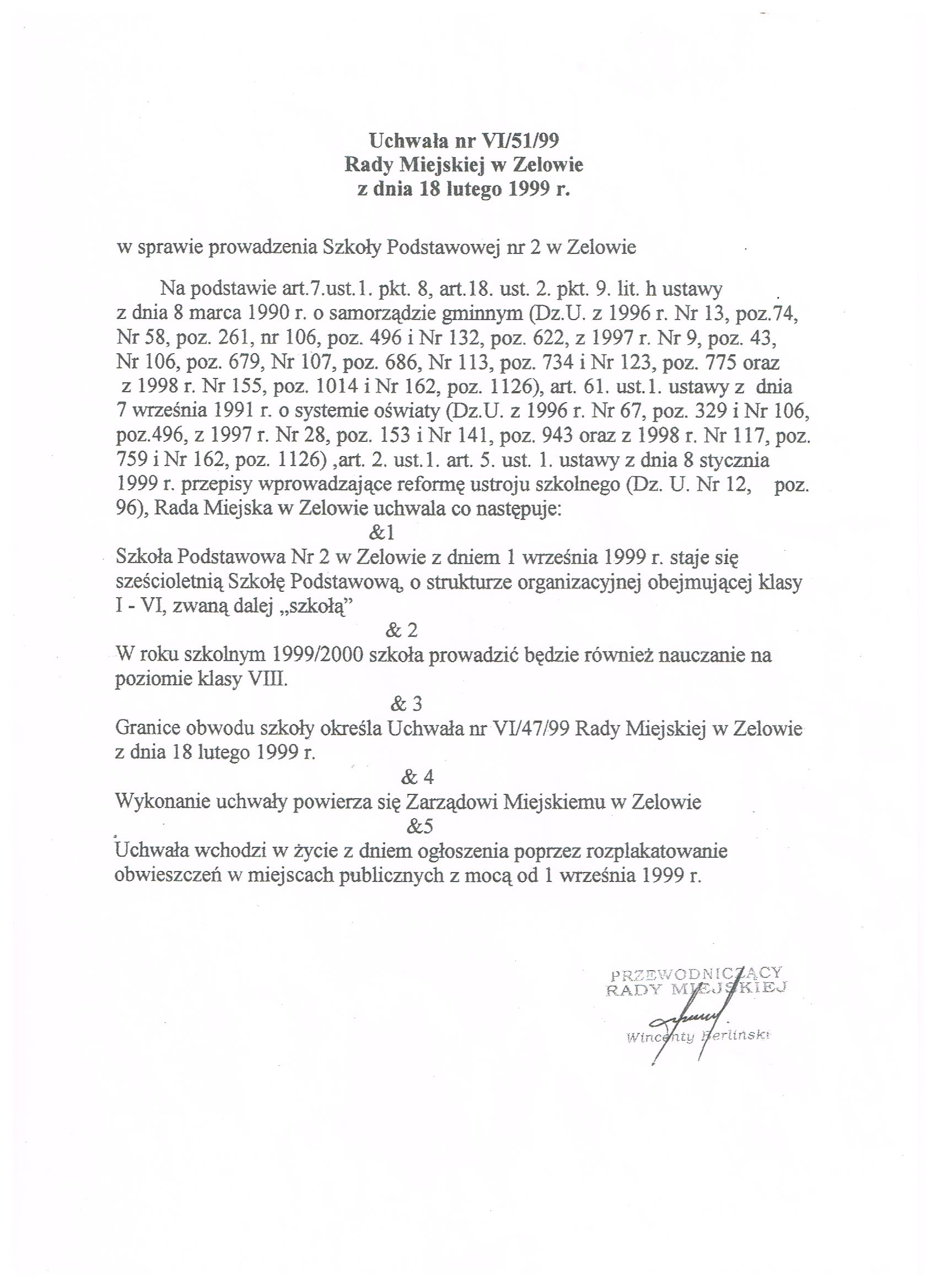 Akt tworzący: Uchwała nr VI/51/99 Rady Miejskiej w Zelowie z dnia 18 lutego 1999 r.
